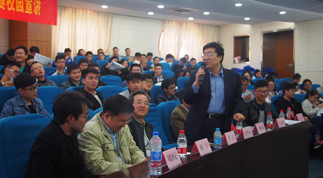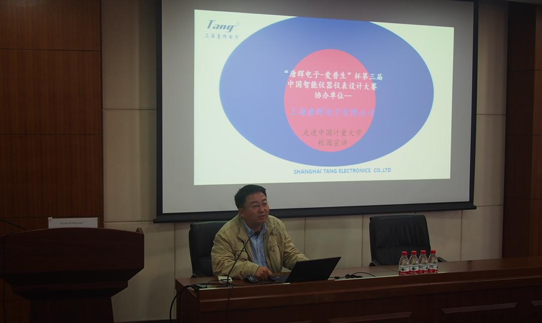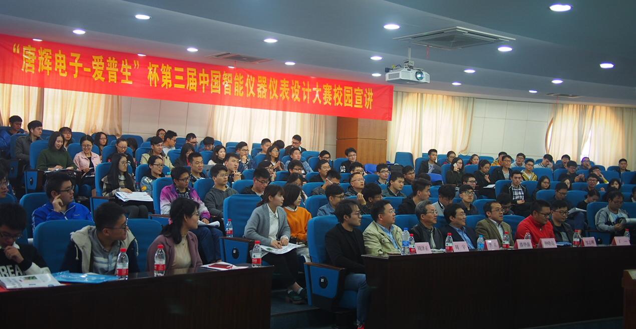 “唐辉电子-爱普生”杯第三届中国智能仪器仪表设计大赛校园宣讲会于10月31日在我校环宇楼T302报告厅隆重举行,大赛组织委员会主任、上海仪器仪表研究所所长滕华强、我校李青教授、爱普生(中国)有限公司IC事业部高级应用芯片经理仲晓亮、中国仪器仪表学会物联网工作委员会副秘书长、上海唐辉电子有限公司总经理周宇、咸亨国际电气制造有限公司软件经理马秉宇、咸亨国际电气制造有限公司部门经理丁一、研究生院副院长邹志刚、第二届大赛一等奖获得者周泽正和我校工科研究生参加了宣讲会。