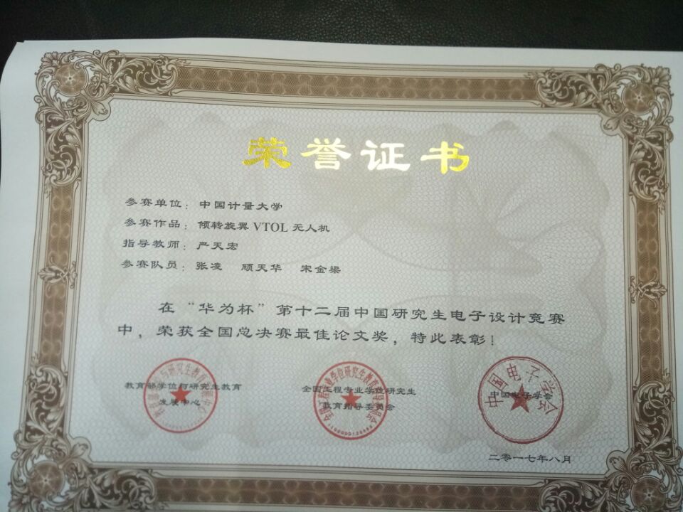 近日,从“中国研究生电子设计竞赛”组委会又传来喜讯,“倾转旋翼VTOL无人机”团队(队员:张凌,顾天华,宋金梁,指导教师:严天宏)提交的论文获得总决赛最佳论文奖,成为全国12篇获奖论文之一。