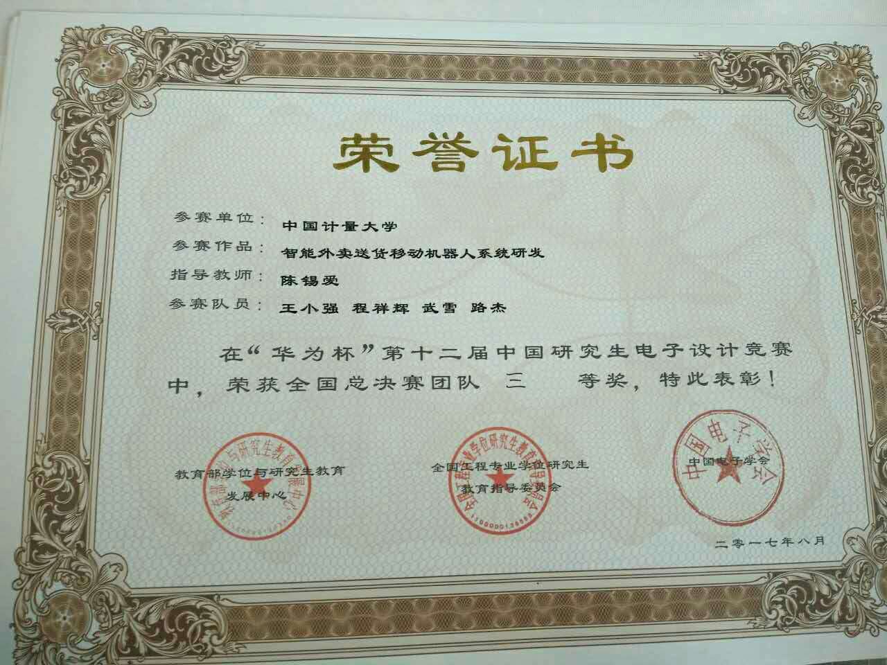 2017年8月19-22日,“华为杯”第十二届中国研究生电子设计竞赛决赛在广东惠州举行。本届大赛共有2055支队伍报名参赛,提交了1945件有效作品,经过分赛区选拔共有来自130家研究生培养单位的289支队伍进入全国总决赛同台比拼,共展风采。我校2支研究生团队“倾转旋翼VTOL无人机”(队员:张凌,顾天华,宋金梁,指导教师:严天宏)和“智能外卖送货移动机器人系统研发”(队员:王小强,程祥辉,武雪,路杰,指导教师:陈锡爱)作为华东赛区一等奖,应邀参加了全国总决赛。