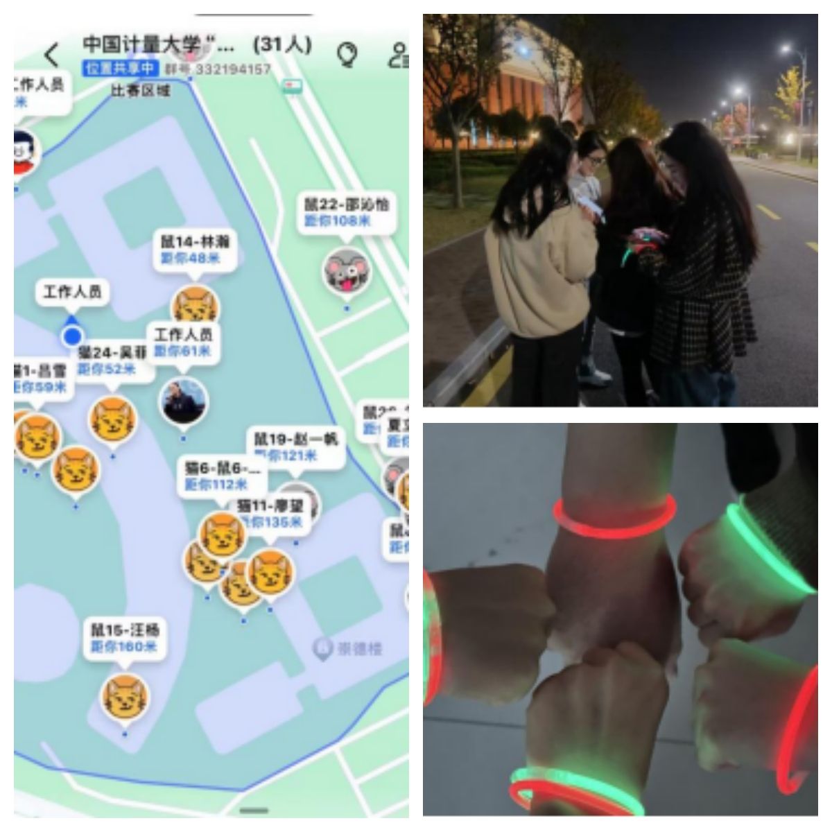 猫鼠游戏是近期在全国年轻人社交圈都非常火爆的活动,在游戏中,猫队的任务是尽可能多地抓住老鼠,而鼠队则需要巧妙地躲避猫的追捕。活动伊始,同学们通过抽签确认身份,统一更换指定头像,戴好荧光手环进入游戏场地,共享位置信息后,在已经沉寂下来的夜间操场,上演一场真人版的“猫捉老鼠”。