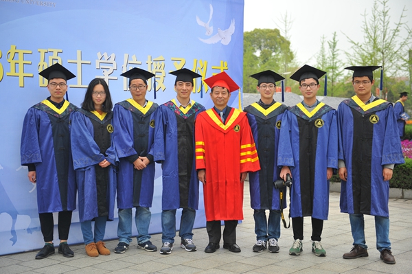 在欢快的音乐声中,主席台校领导为硕士学位获得者颁发学位证书、拨正流苏并合影留念。校学位评定委员会主席、校长林建忠教授还单独与毕业生合影留念。