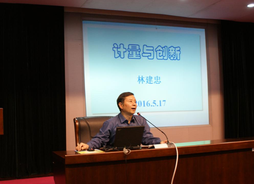 林建忠教授以“创新赋计量以活力,计量给创新以动力”开题,引经据典分别对时间、长度、质量、温度、力学、热工、电磁、无线电、热辐射和电离辐射等单位做了介绍,对万有引力、普朗克常数、圆周率等著名常数做了说明,他从手段创新、量值创新、领域创新、基准创新和思维创新等五个方面对计量与创新做了分析。随着社会发展和科技进步,创新所引发的计量方法使计量单位的准确性、可靠性有了大幅度提高。其次,林建忠教授通过大量生动事例介绍了经典计量与实物基准、量子计量等内容,对分数维、自相似理论和自己的博士论文研究内容做了说明;最后,通过地心、日心、万有引力三层宇宙认识,蒸汽机、电能、核能三大技术革命,相对论、量子力学、混沌动力学三项重要发现和百米赛跑、游泳、撑杆跳三个体育项目等,林校长指出计量测试技术和创新意识的发展,不断影响着人类认识世界和改造世界的进程,对推动技术革命、工业创新和人类发展作出了巨大的贡献。他希望我校研究生能认真学习专业知识,在学术论文和学位论文工作中积极探索、勇于创新。