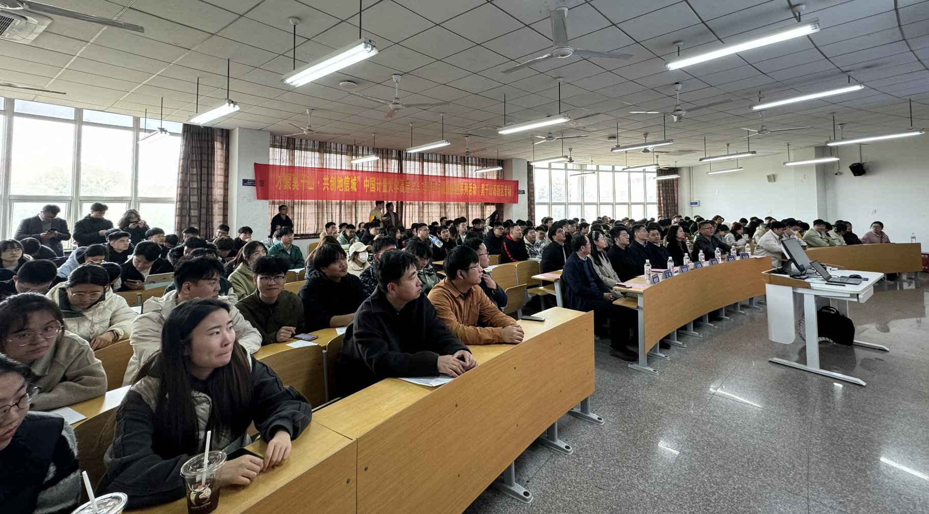 章洪春详细介绍了德清县的地理位置、自然资源和人文环境以及湖州莫干山高新区的发展历程、产业布局和人才政策等相关情况。湖州莫干山高新区作为国家高新技术产业开发区,在智能制造、新能源、新材料等领域取得了显著成绩,并形成了以高端装备制造、生物医药、地理信息等为主导的产业格局。吴伟昊向同学们详细介绍了德清县人才引进政策。他强调德清县对人才的重视和渴望,详细解读政策中各项优惠措施,包括住房补贴、生活津贴、创业补助等,以吸引更多优秀人才选择德清县作为职业发展之地。
