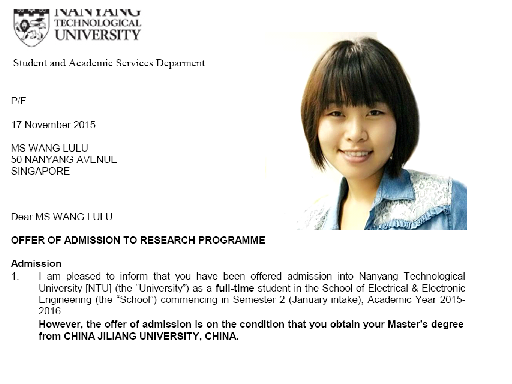 近日,我校光电学院2012级光学工程专业硕士毕业生王鹿鹿同学收到新加坡南洋理工大学(Nanyang Technological University)研究生院的通知,喜获该校博士入学资格及全额奖学金。