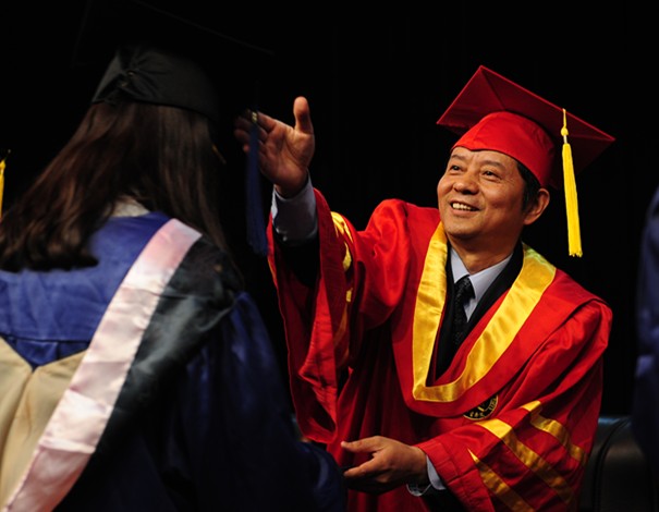 在欢快的音乐声中,主席台校领导为硕士学位获得者颁发学位证书、拨正流苏并合影留念。校学位评定委员会主席、校长林建忠教授还单独与毕业生合影留念。