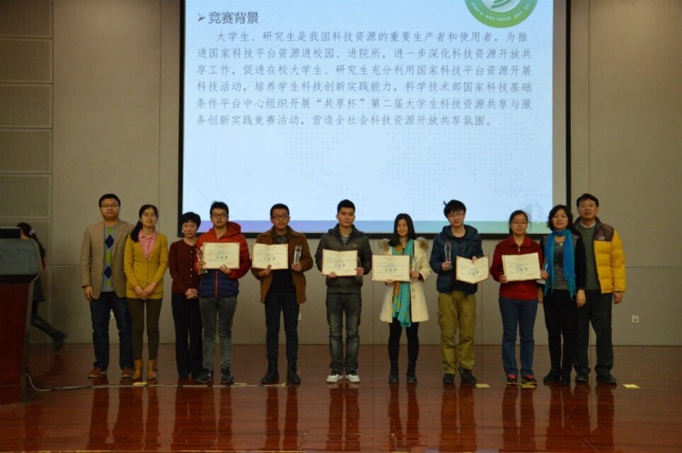 由国家科技基础条件平台中心主办的第二届“共享杯”大学生科技资源共享与服务创新实践竞赛总结大会在北京举行。本次竞赛自2014年5月15日启动以来,得到了全国各地大学生,研究生的热烈响应,共有1500多个团队或个人报名参赛,竞赛作品717件,其中论文501件、软件100件、多媒体116件。竞赛共评出特等奖1名,一等奖3名,二等奖6名,三等奖20名,优秀奖75名,优秀指导老师奖13名,优秀组织奖5名。我校共有10件作品获奖,其中二等奖1项,三等奖3项,优秀奖6项,学校也凭借良好的组织工作再次获得优秀组织奖。