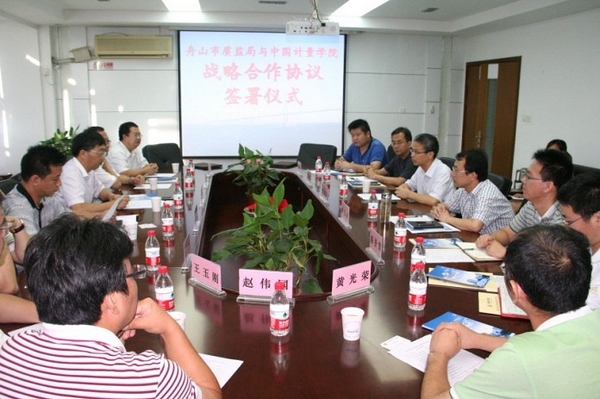 会议在舟山市质量技术监督检测研究院召开,舟山质检院李存军院长、刘瑛副院长、科技处黄海清副处长、计测学院李东升院长等相关领导专家参加了此次签约仪式。