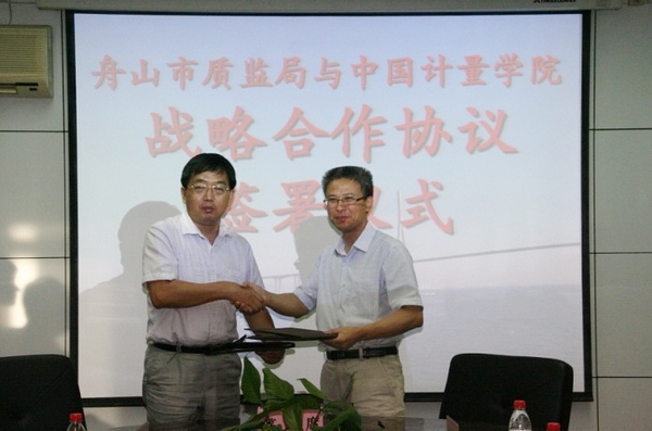 2013年8月15日下午,我校俞晓平副校长与舟山市质量技术监督局严国强局长签署了双方战略合作协议,并授予舟山市质量技术监督检测研究院“中国计量学院研究生培养基地”。