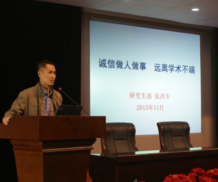 研究生部副主任张洪军以《诚信做人做事,远离学术不端》为题给大家做科学道德与学风建设宣讲,他以居里夫人、达尔文、竺可桢等国内外著名科学家的事迹告诉大家在学习、科研和学位论文过程中要有求真求实、严格严谨的精神;并以近年来国内外发生的学术不端案例及造成的不良后果,教育和引导研究生诚实诚信做人,恪守学术道德,远离学术不端。
