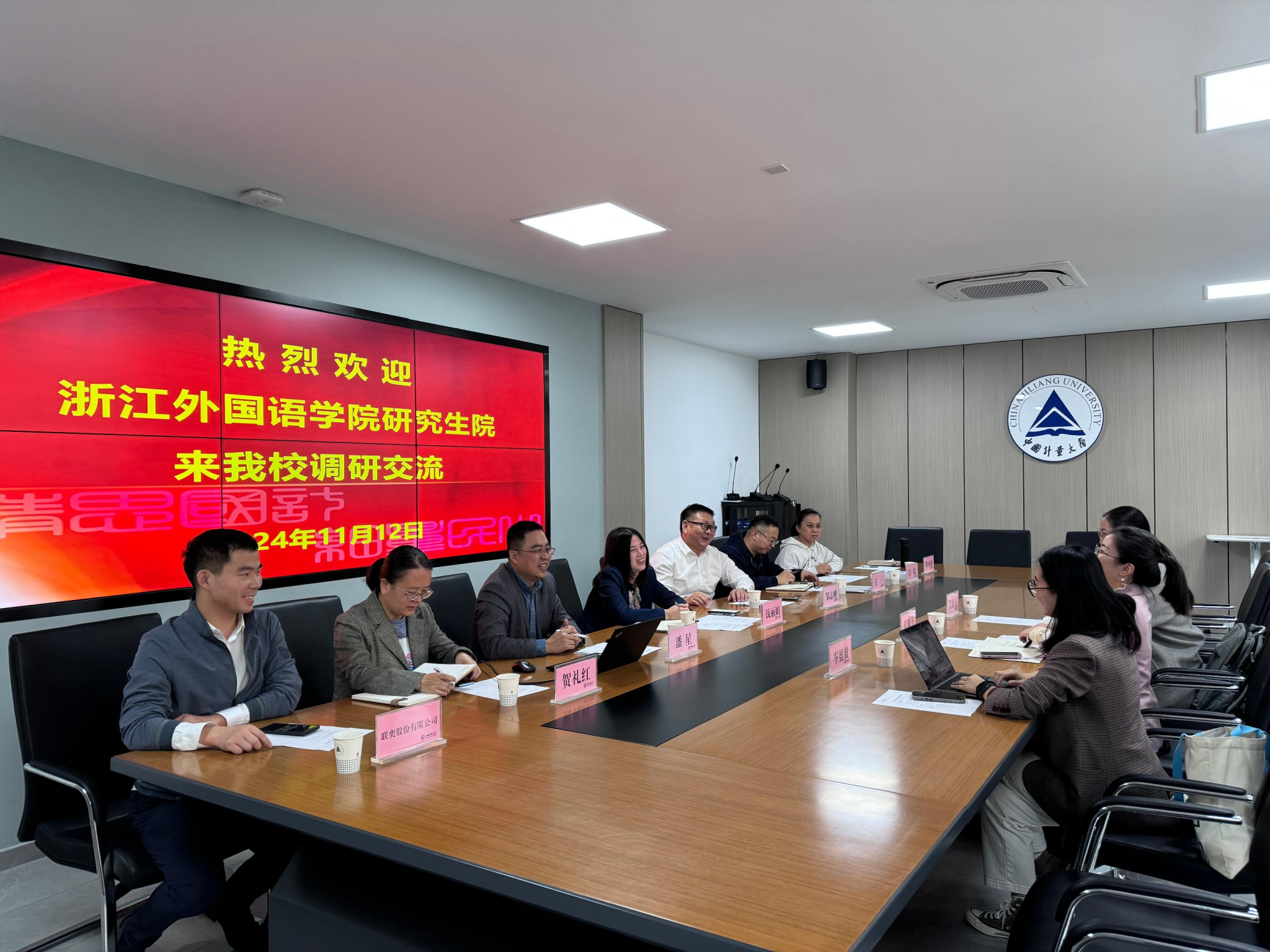 近日,我省新增硕士学位授权单位浙江外国语学院研究生院(筹)副院长范馨予一行来我校调研交流研究生教育相关工作。研究生院院长钱丽娟,研工部常务副部长邹志刚、副部长潘星,研究生院招生、培养、研工工作人员,联奕科技代表蔡伟荣参加了调研交流会。