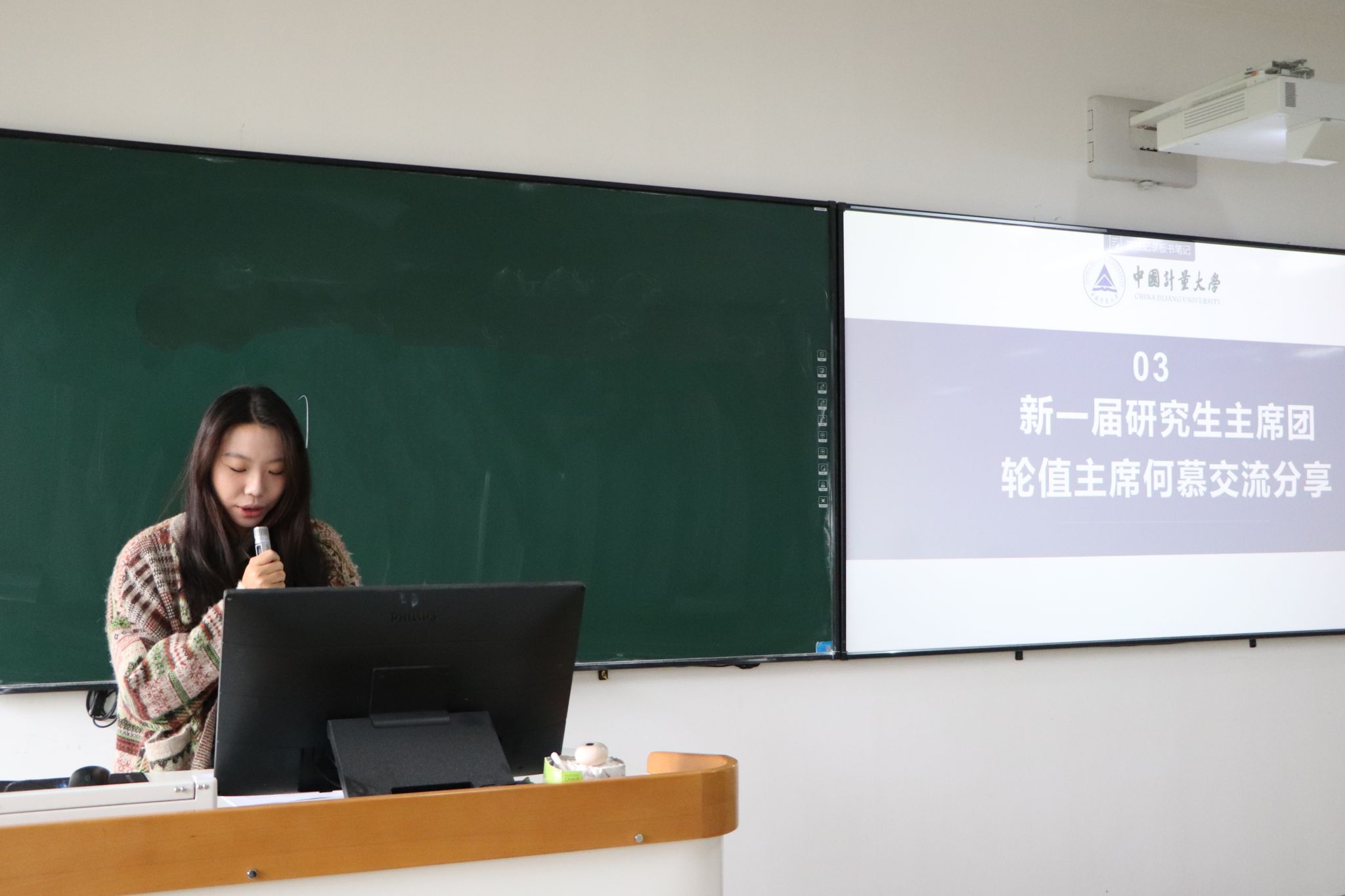 新一届校研究生会主席团轮值主席何慕代表主席团发言,她向新成员的加入表示欢迎,并围绕自身在研会的成长经历,分享了收获与体会,她希望研会成员们能够平衡学业与工作,在完成研会主责主业工作基础上,加强协作互助,在服务同学中收获成长,成为有理想、敢担当、能吃苦、肯奋斗的新时代青年;研究生会各部门负责人分别对部门中心工作、成员组成做了介绍,共同诠释“全心全意为同学服务”的宗旨。