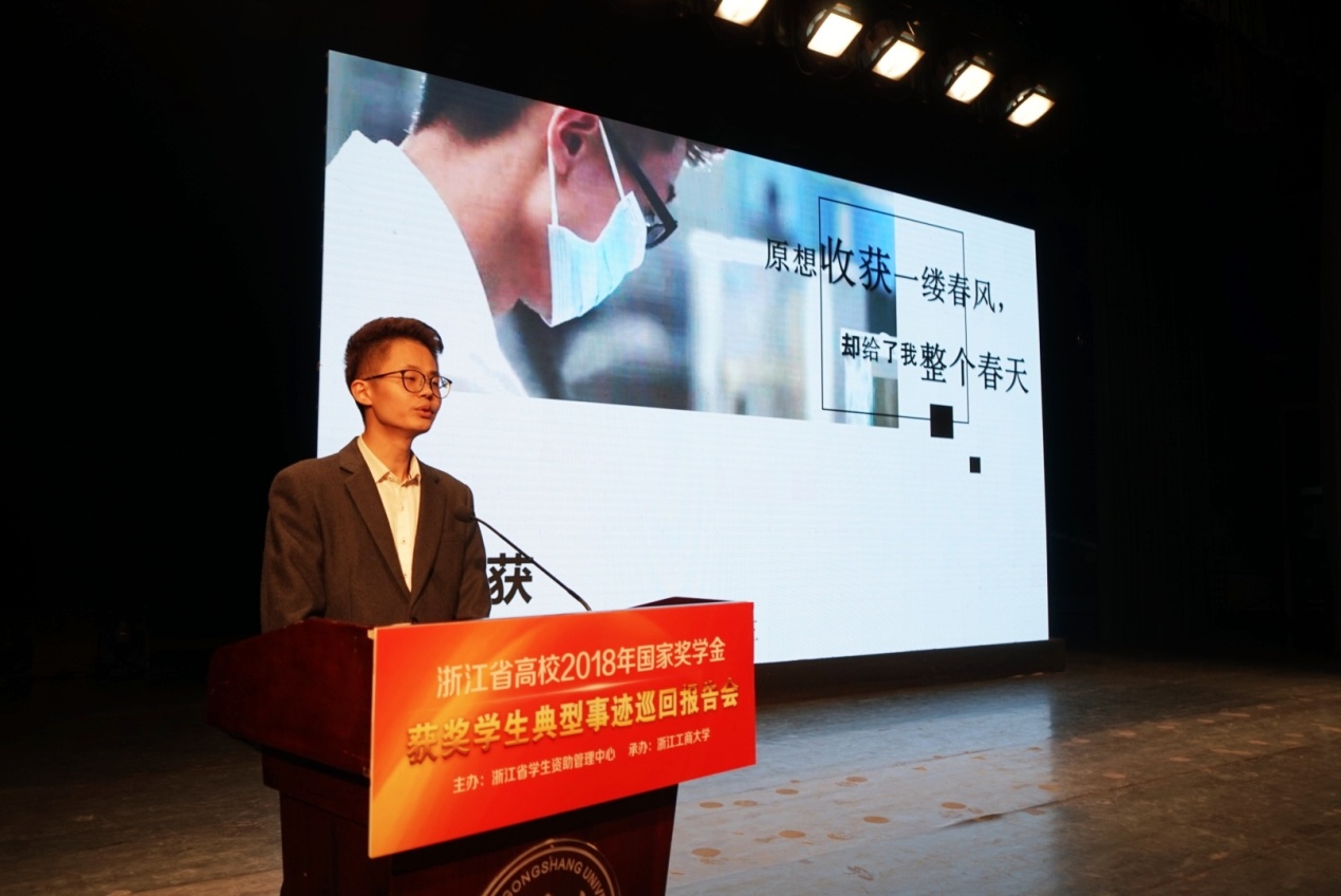 近日,浙江省高校2018年国家奖学金学生典型事迹巡回报告会在省内各高校举行,我校材料科学与工程学院2016级硕士研究生刘群获作为宣讲团成员代表我校参加了本次巡回报告会,分别在浙江工商大学、浙江越秀外国语学院、慈溪中学和浙江机电职业技术学院做精彩报告,分享了他在思想政治、学习科研和生活等方面的成长经历和心得体会。因刘群获同学的经验分享得到大家的一致好评,他又受邀参加了在温州大学举办的浙江省研究生国家奖学金经验分享会,进一步展现了我校研究生良好的精神风貌。