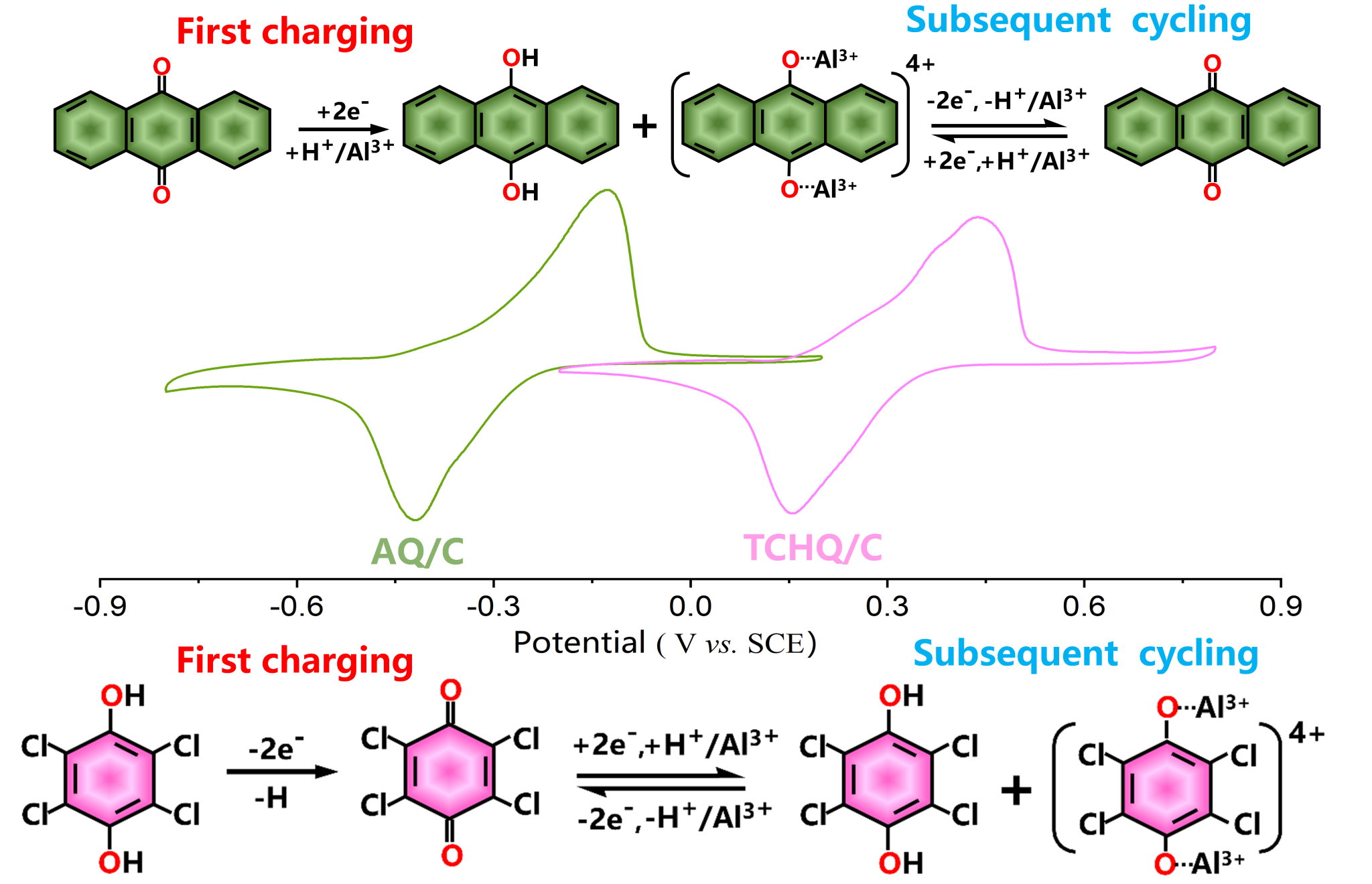 醌/氢醌衍生物,如质体醌和泛醌等,对于生命系统的能量存储与转化(呼吸作用和光合作用)至关重要,它们可以在细胞体液环境中实现高效可逆的质子耦合电子转移反应,这激发了科研人员探索以醌/氢醌衍生物为活性物质的新型电池技术。本工作研究了9,10-蒽醌(AQ),四甲基氢醌(TMHQ)和四氯氢醌(TCHQ)分别在Al2(SO4)3,ZnSO4和MgSO4水溶液中的氧化还原行为。研究发现以AQ为负极,TCHQ为正极,Al2(SO4)3水溶液为电解液的全有机水系电池表现出最佳的电化学性能。通过理论计算和实验表征,本工作提出了如图所示的质子与铝离子共嵌入电荷存储机理。本研究工作可为全有机水系电池的设计提供借鉴与指导。