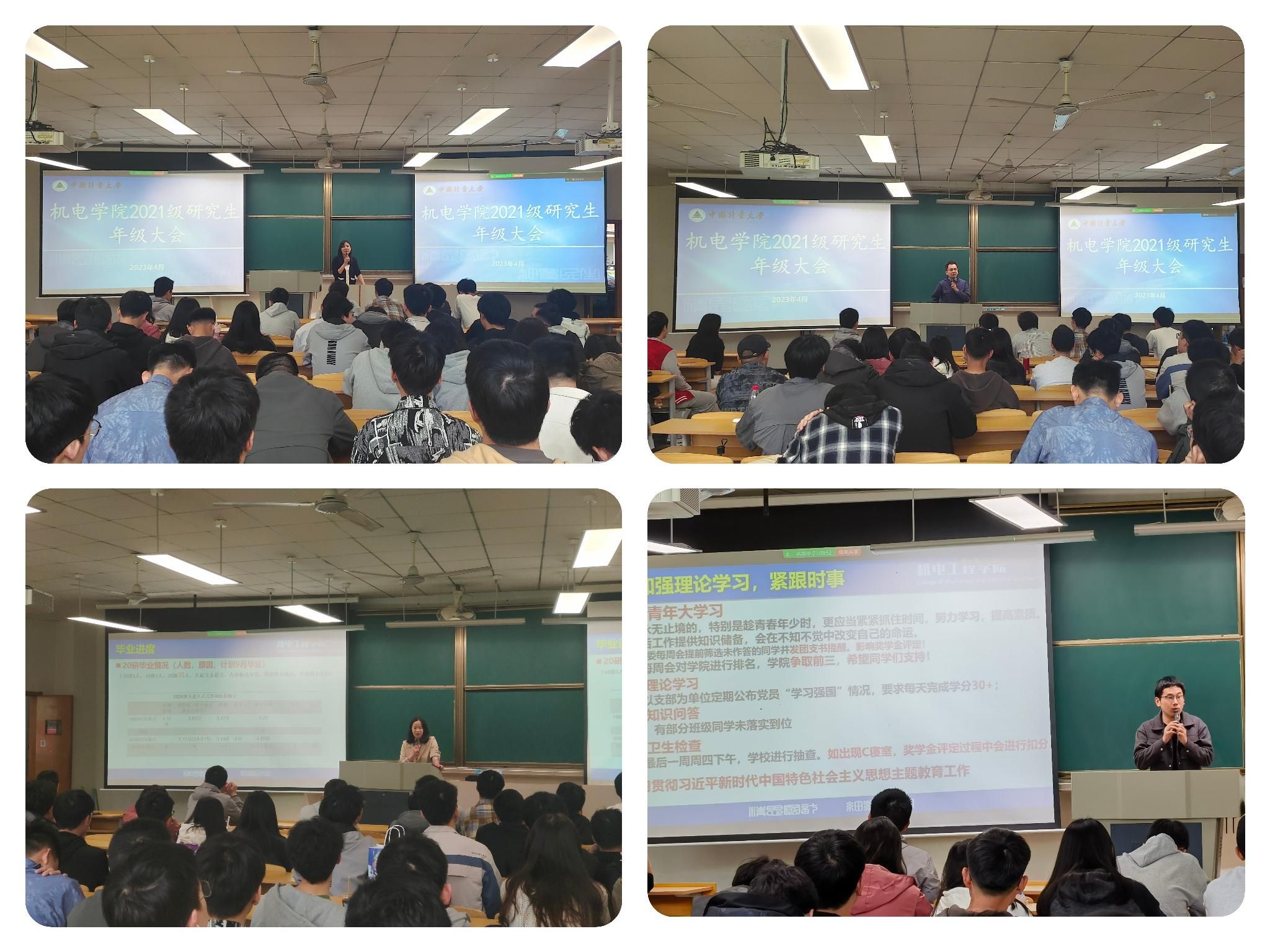 为进一步引导2021级研究生做好学业规划,强化学生的安全教育和日常管理,4月23日,机电工程学院于环宇T102召开了21级研究生年级大会。学院党委副书记杨玉书、党委委员蔡慧、研究生秘书和21级研究生辅导员出席会议,2021级全体研究生通过线上线下相结合的方式参加了会议。