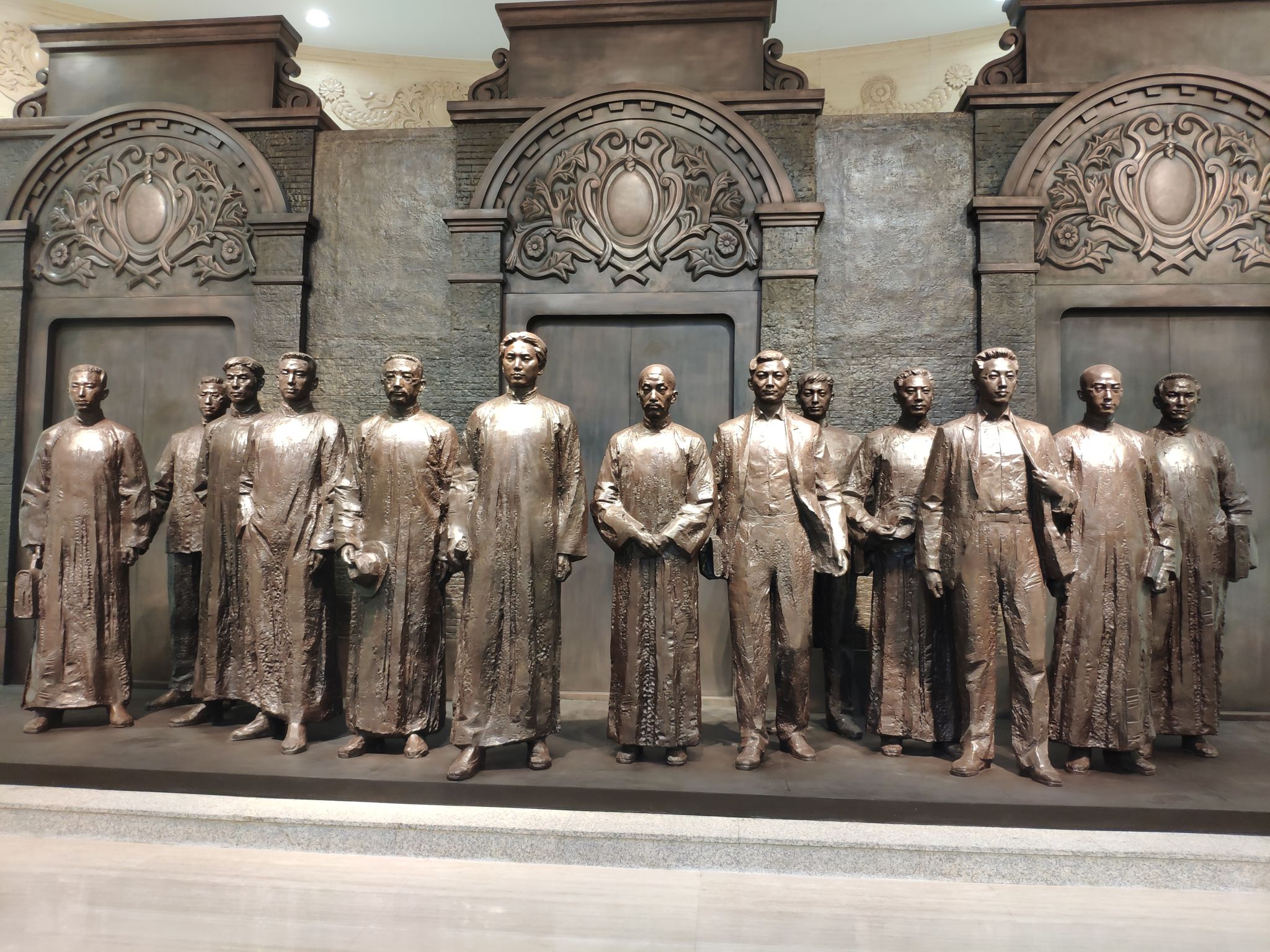 第一站是中共一大会址纪念馆。回顾光辉历史,追寻不变初心。青年学子走进一大会址,瞻仰中共一大代表群像浮雕,参观“前仆后继、救亡图存”“风云际会、相约建党”“群英汇聚、开天辟地”等专题展区。驻足于一张张图片、一件件实物前,大家时而陷入沉思、时而讨论交流、时而详细询问,在回顾建党百年的峥嵘岁月后,对共产党人的初心和使命有了更加清晰的认识,对伟大的建党精神有了更为直观的体会。