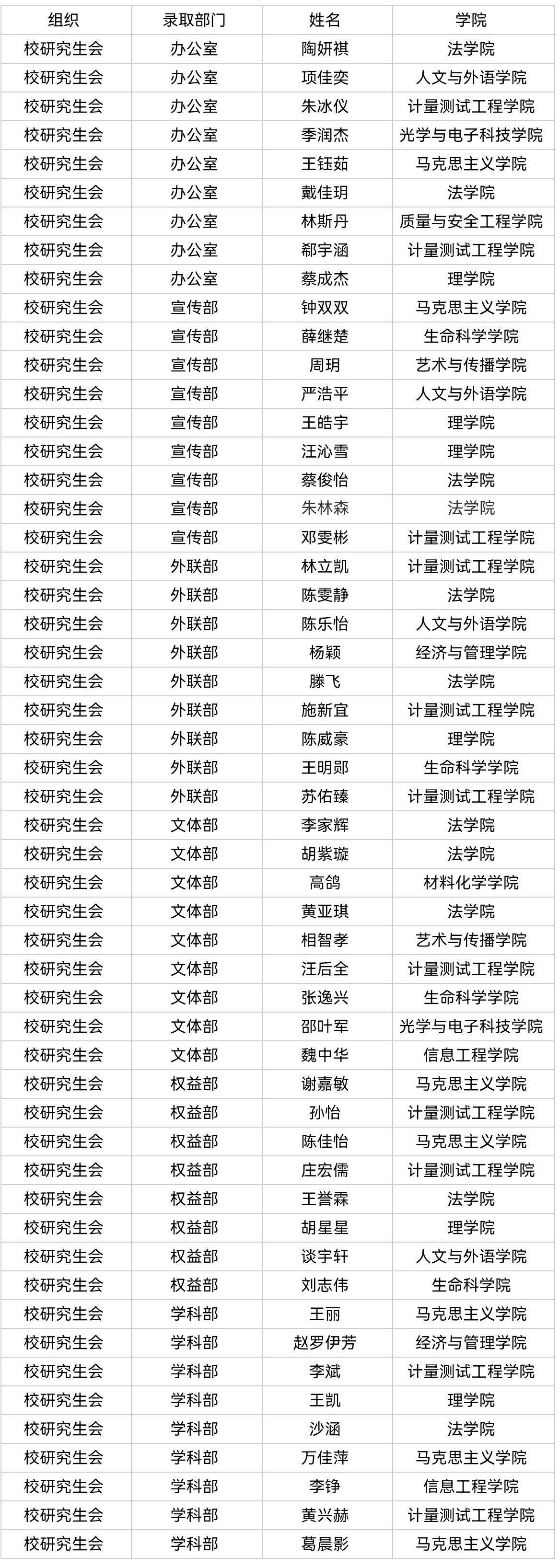 为深入学习贯彻习近平新时代中国特色社会主义思想,贯彻落实共青团中央、教育部、全国学联印发的《关于推动高校学生会(研究生会)深化改革的若干意见的通知》(中青联发〔2019〕9号)精神,深化学校共青团改革创新,打造一支强有力的研究生骨干队伍,我校坚持“公开、公平、公正、竞争、择优”原则,于近日顺利开展了2023-2024学年校研究生会公开招募工作。经过自荐和面试等环节,确定了拟录用人员名单,现将名单公示如下: