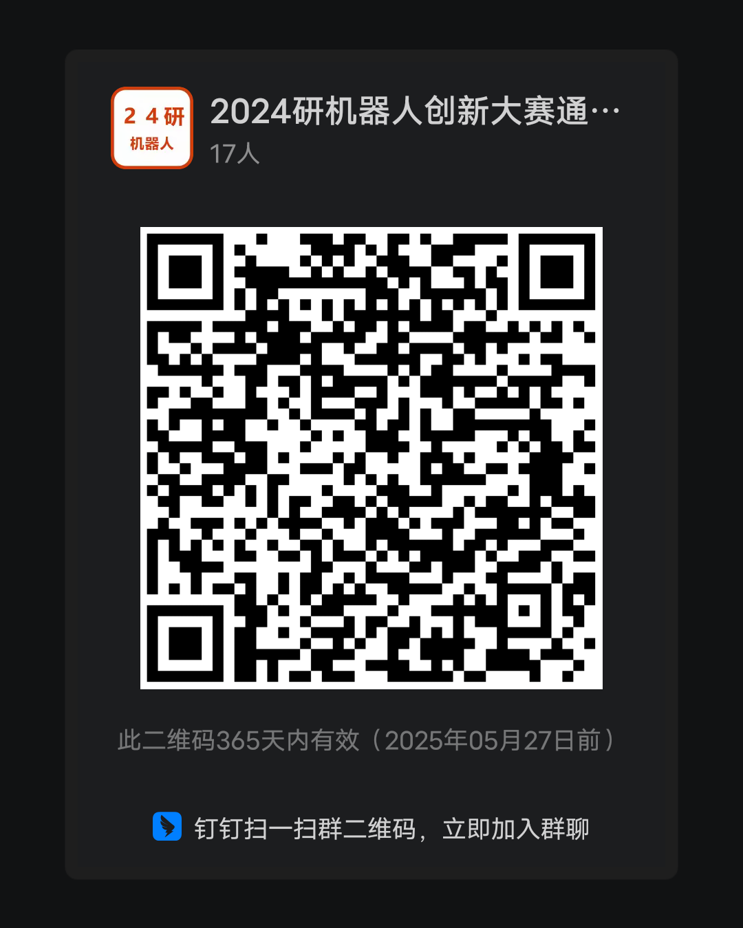 各参赛队队长请加入校内竞赛通知钉钉群,群名称:2024研机器人创新大赛通知群,二维码见下。
