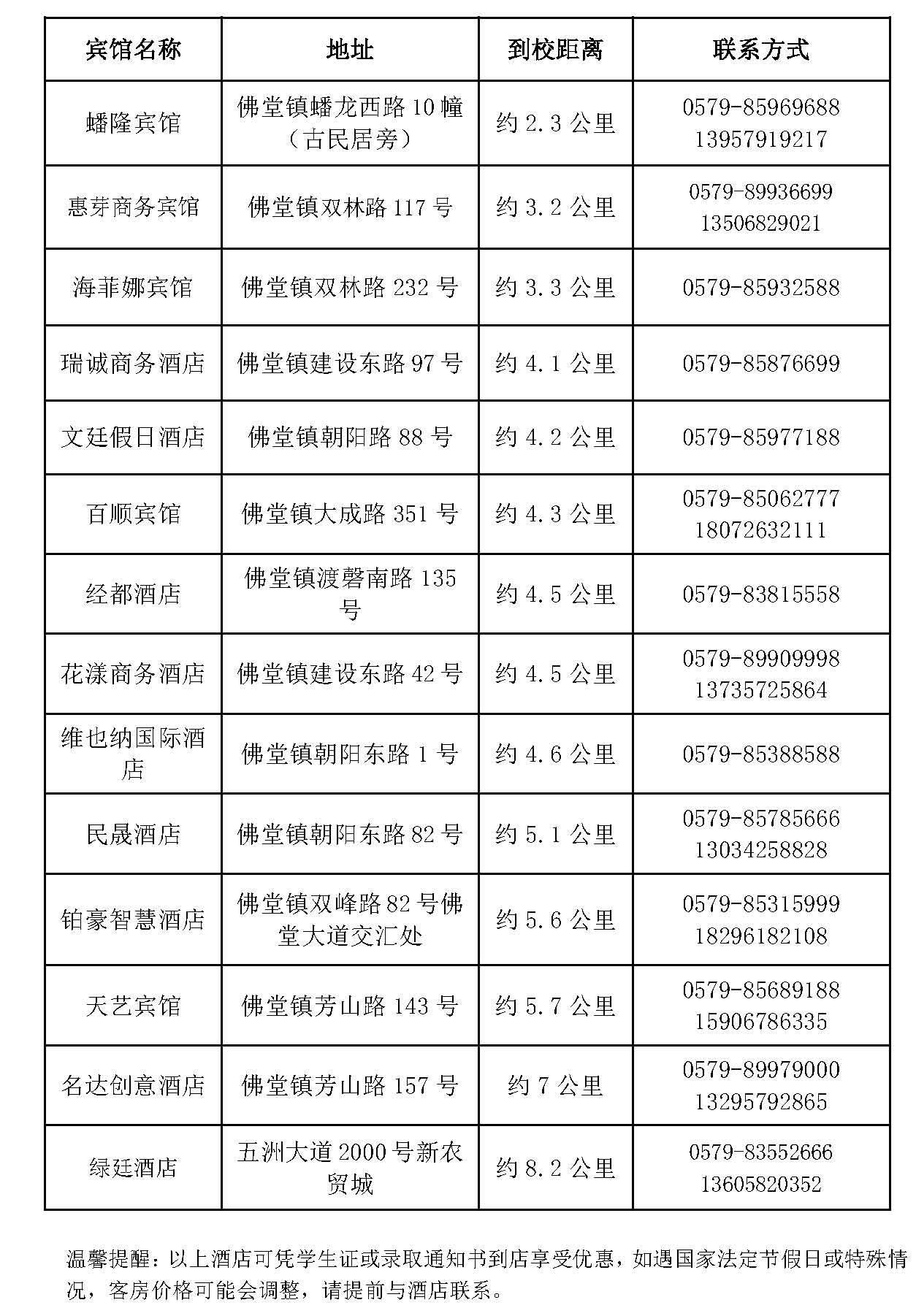 2.为方便新生开学报到,经学校与义乌佛堂镇政府共同努力,为学生家长提供学校周边优惠酒店,具体酒店宾馆信息另见附页,建议来校报到前做好预约。